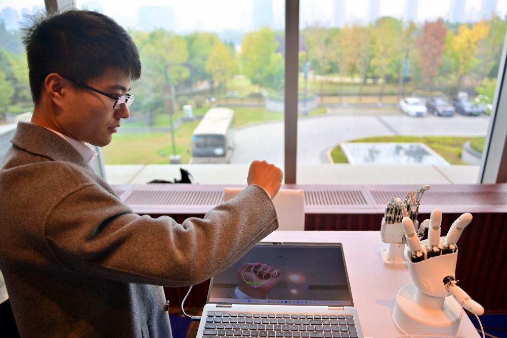10月17日,正在中国科学院沈阳从动化研究所展台,工做人员演示“仿生五指工致手”展品。记者 吴青昊 摄。