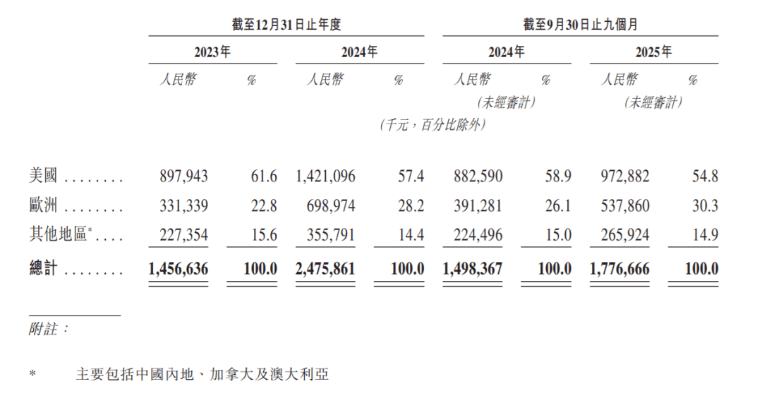 △按照市场地域划分,2025年1-9月,美国市场营收达9。7亿人平易近币,占54。8;欧洲5。3亿,占30。3%;中国内地、、等其它地域2。6亿,占14。9%。美国和欧洲占领85。1%,中国内地可能10%都不到。