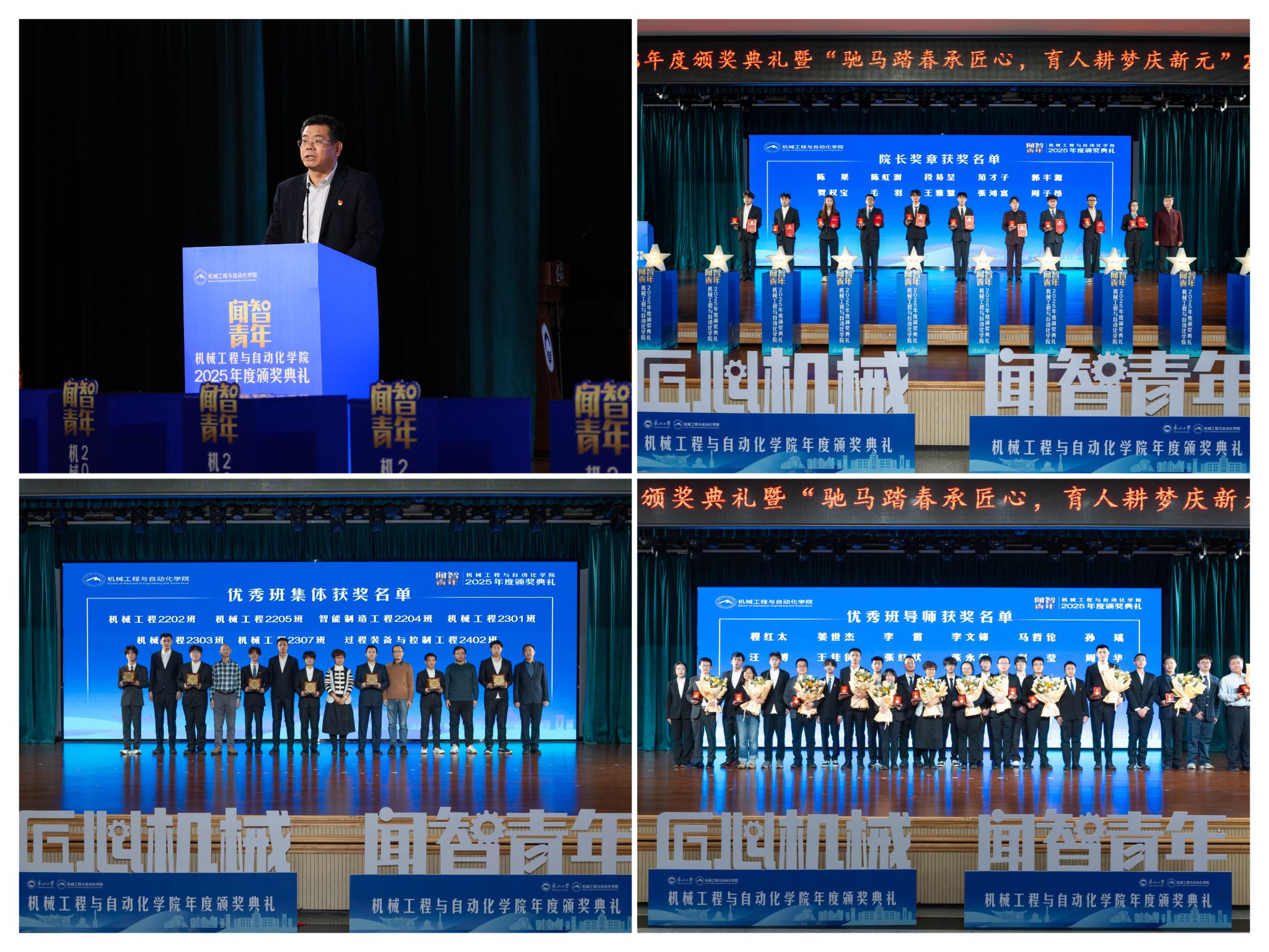 学院党委郝建山正在致辞中系统回首了一年来学院取得的主要成绩。投身深度金属矿智能开采纳配备全国沉点尝试室扶植,并正在环节科研范畴实现标记性冲破,获得国度严沉专项支撑。同时,学院成功引进增材取激光制制范畴领军团队,稳步推进学校新增学位点扶植,为久远成长奠基根本。正在人才培育方面,学院学子表示凸起,研究生学术丰盛,正在“挑和杯”“中国国际大学生立异大赛”等多项赛事中斩获国度级项,结业生就业率持续连结高位,展示了全面成长的优良素养。郝建山阐释了“闻智青年”品牌的育人内涵,勉励全体师生胸怀“国之大者”,将小我成长融入“制制强国”计谋,过硬本事,怯于立异创制,勤奋成为担任平易近族回复大任的时代新人。副院长罗忠表扬决定。颁环节分三轮顺次进行。起首颁布的是“院长章”,刘云飞为毛羽等10名正在专业进修、科技立异、社会实践等方面表示杰出的学生颁布章。随后颁布“优良班集体”项,班导师代表为7个正在班风、学风及凝结力扶植中成效显著的班级颁。最初,仪式聚焦育人一线论理学生代表向获评“优良班导师”的教员们献上鲜花取荣誉证书,表达诚挚感谢感动。“院长章”获得者代表毛羽连系科研竞赛取意愿办事履历,讲述了“道阻且长,行则将至”的成长;“优良班集体”获代表豆煜轩分享了班级凝心聚力、共建优秀学风的活泼经验。正在“闻智匠心 共话青蓝”出格环节,优良班导师马哲伦取所带班级学生代表刘定佳同台交换,从分歧视角展示了师生间思惟引领、学业互帮、讲授相长的温情互动,彰显了育人一线的深挚交谊取结实成效。据悉,“闻智青年”是机械工程取从动化学院出力打制的文化育人品牌。本次颁仪式既是年度的集中展现,也是典型树立、激励朝上进步的主要平台,旨正在指导全体学生以先辈为楷模,坚想、夯实专业根本、锻制立异能力,勤奋成长为具有家国情怀、全球视野取创制活力的杰出工程人才,为学校“双一流”扶植和高质量成长注入芳华力量。
